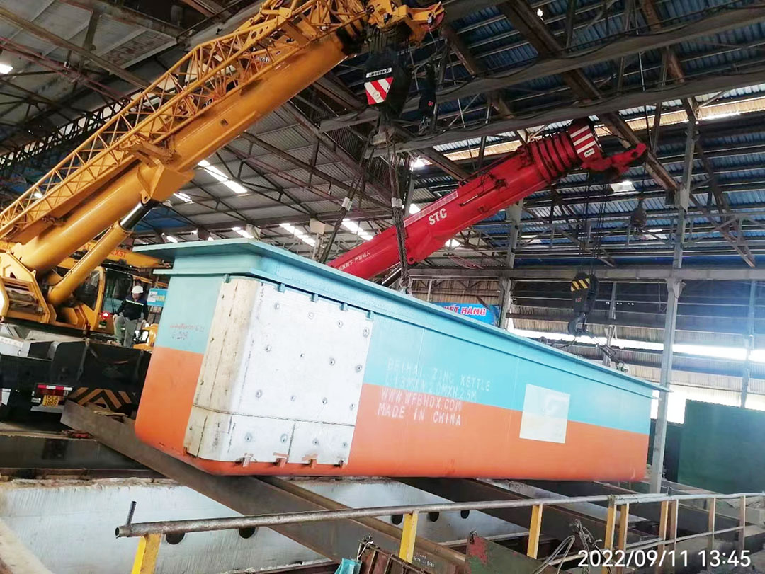 该锌锅采用高强度耐腐蚀合金材料与多层隔热结构设计,配备智能化分区温控系统,在保障锌液温度均匀稳定的同时,显著提升热效率与设备使用寿命。面对复杂的海外现场条件,我公司技术团队通过远程指导与现场协作相结合的方式,精准完成设备定位、耐火浇筑及管道连接,确保安装质量符合国际技术标准。